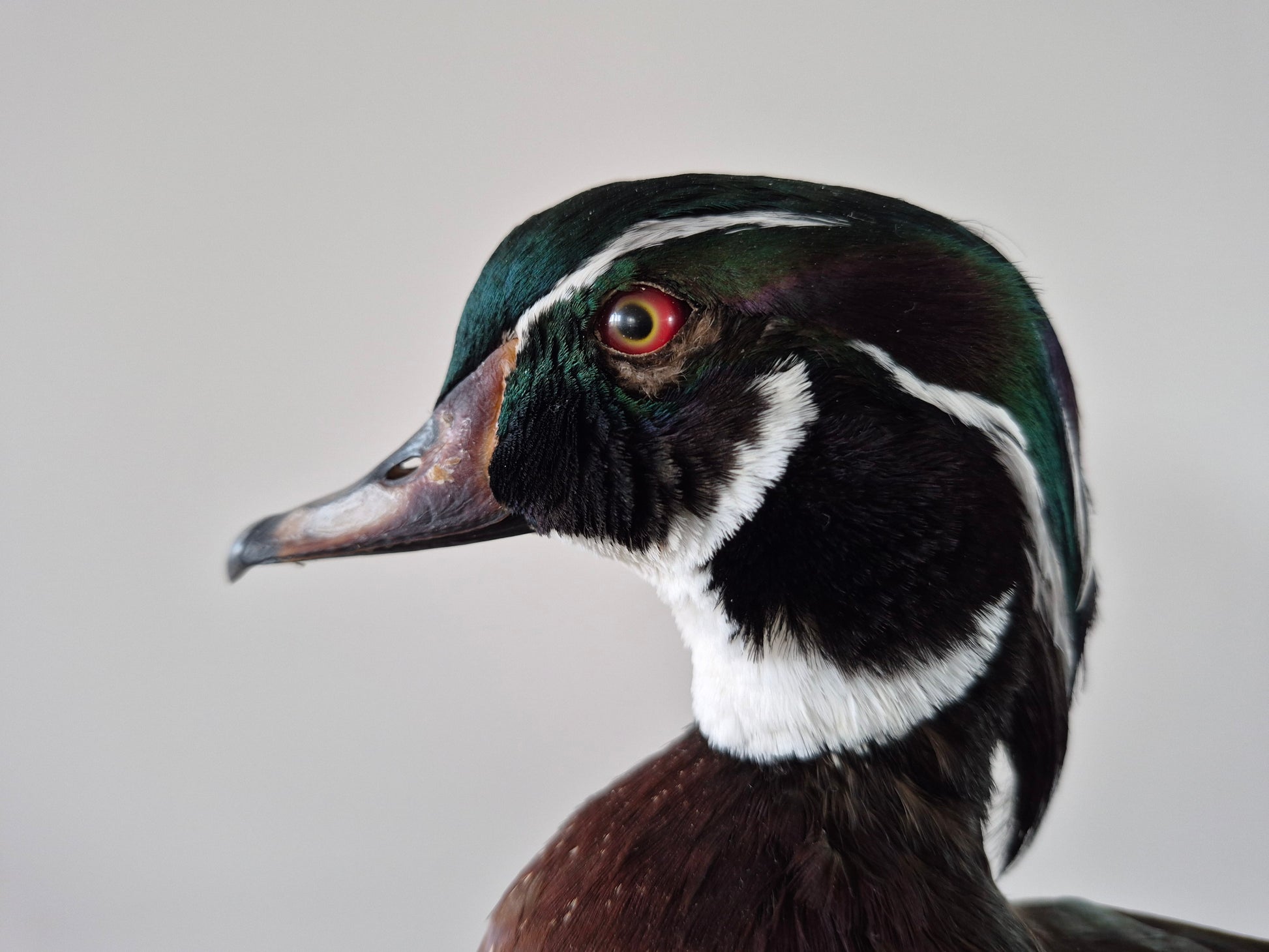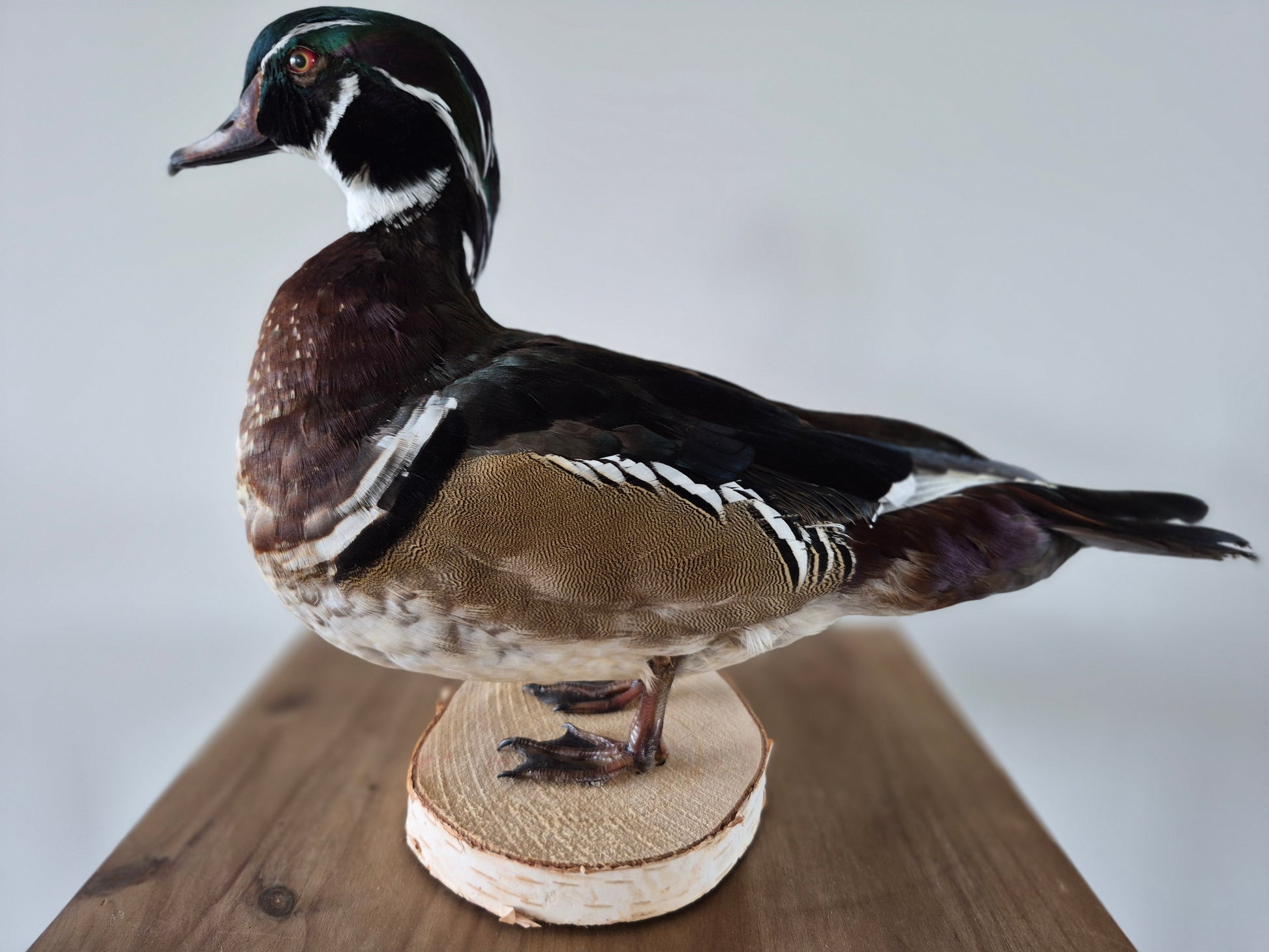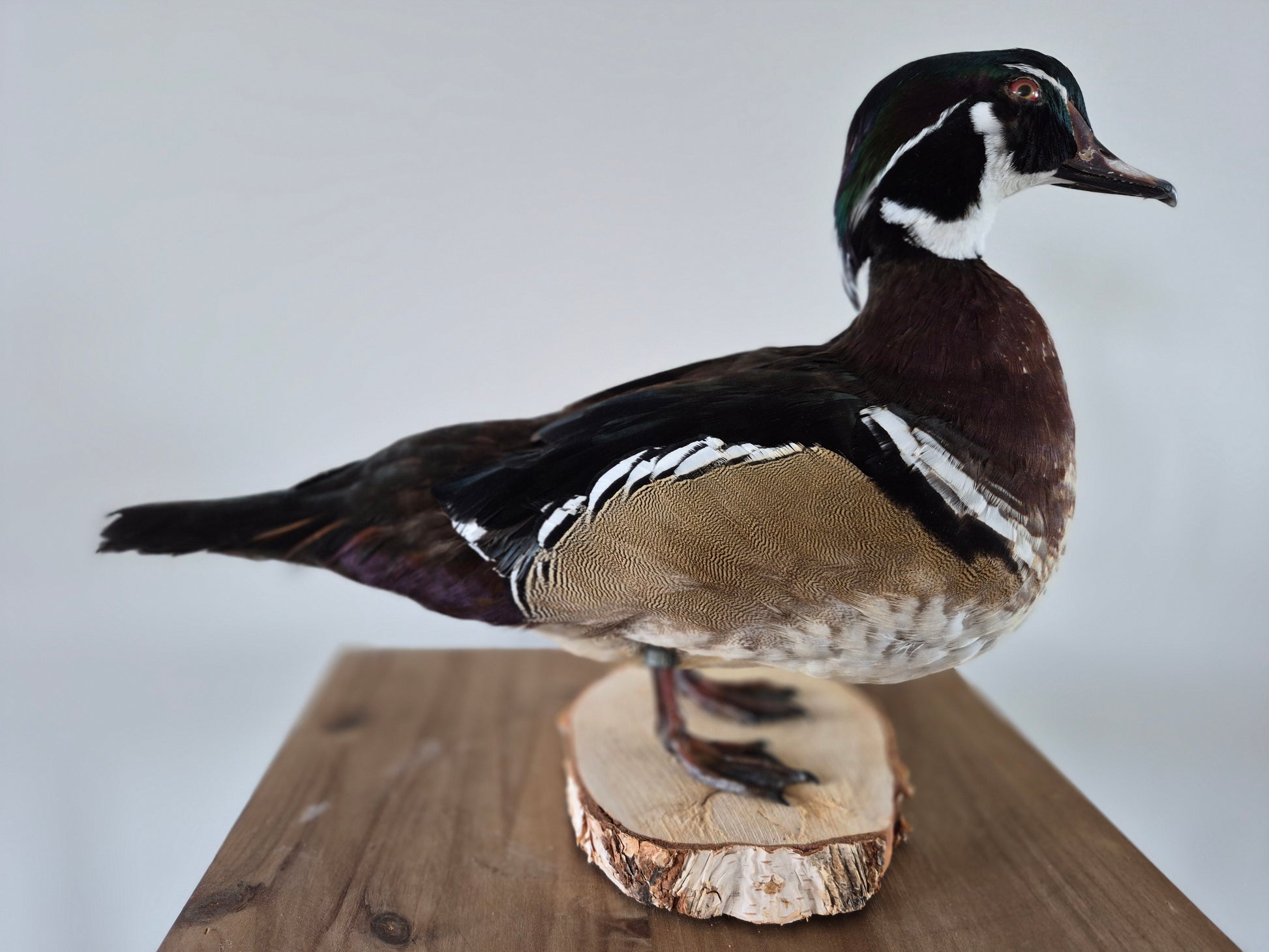 Carolina-eend (Aix sponsa). Mooi gekleurde eend, voornamelijk te vinden in Oost-Amerika. De eend nestelt zich hoog in bomen, in oa. verlaten spechtholen.
